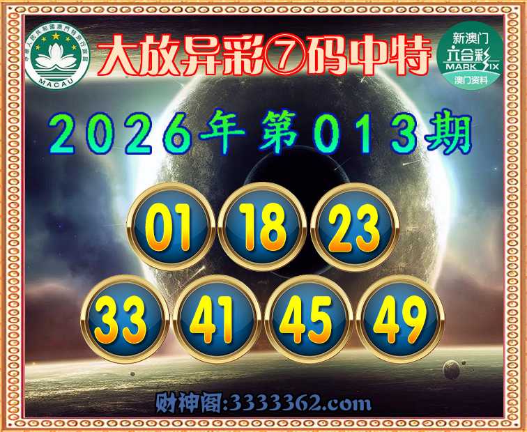 013期:【大放异彩】 ☺️⑦码中特☺️【01.18.23.33.41.45.49】开:01